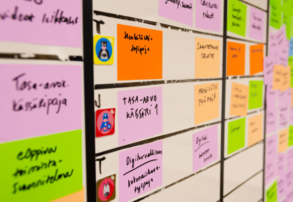Työpajatilamme on ollut nyt käytössä muutaman kuukauden, ja siellä on vedetty työpajoja joka viikko useampana päivänä. Lisäksi se on tiimimme tilannehuone, jossa on tauluilla näkyvillä sprinttien suunnittelu, päivittäiset työtehtävät sekä tuotantojen ja oppimisen arviointi. Tila tukee sekä tuotantoprosessiamme, sprinttityöskentelyä että leania sisällöntuotantoa. Visuaalinen ohjaus auttaa viestinnässä, työn hallinnassa ja priorisoinnissa.