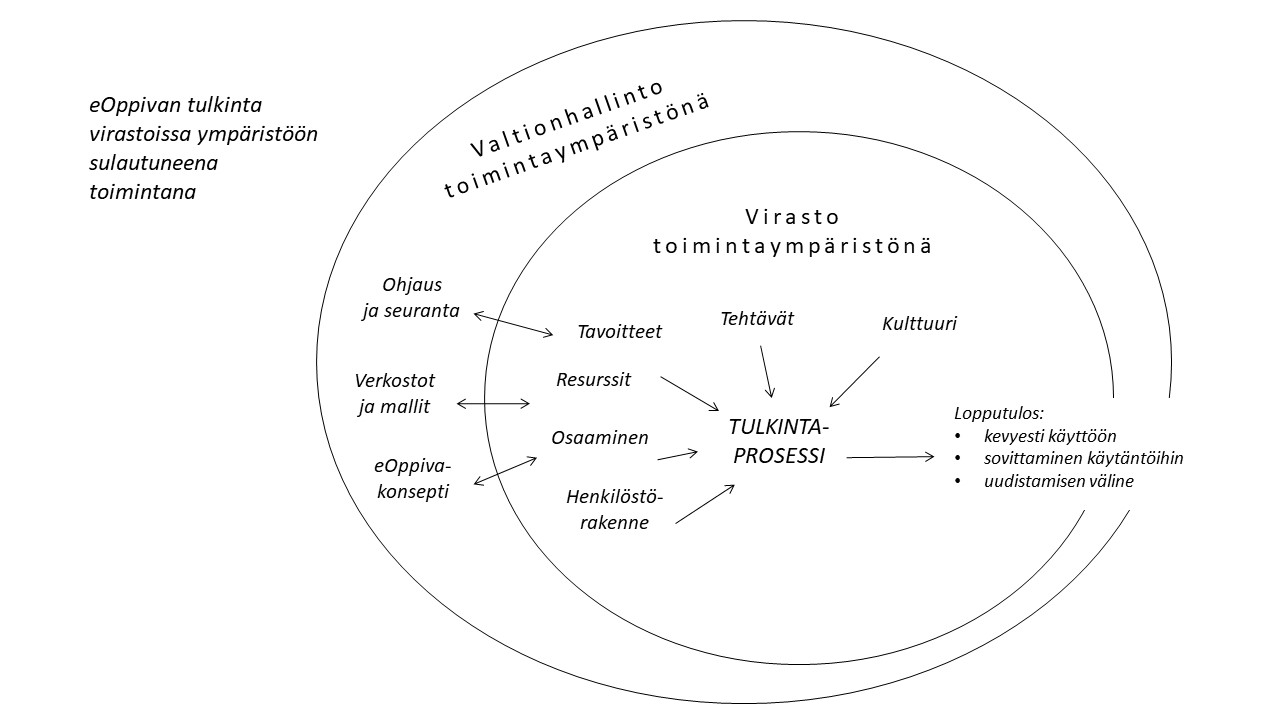 Virastojen erilaiset lähtökohdat ja toimintaympäristön vaikutus näkyi siinä, miten eOppivaa oli lähdetty hyödyntämään virastossa. Osin eOppivaa otettiin kevyesti käyttöön, jolloin korostui henkilöstölle viestiminen uudesta oppimisen mahdollisuudesta. Moni virasto sovitti eOppivaa aktiivisesti osaksi olemassa olevia HRD-käytäntöjä, mikä näkyi muun muassa eOppivan sisältöjen linkittämisenä olemassa olevaan koulutustoimintaan. Paikoin eOppivaa hyödynnettiin henkilöstön osaamisen kehittämisen käytäntöjen kokonaisvaltaisemmassa uudistamisessa. Vaikka edellä esitetty kolmijako on nähtävä analyyttisena erotteluna, toi tutkielma kuitenkin esille, ettei yhteinen väline vielä itsessään tarkoita yhtenäisiä toimintatapoja.