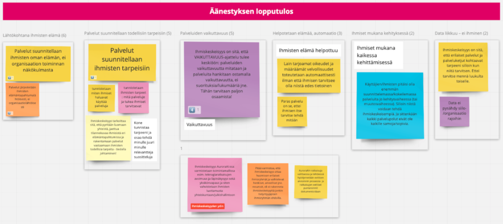 Yhteinen työskentely tapahtui kolmessa digitaalisessa työpajassa Miron ja Google Sliden avulla. Vaikka työkalut olivat monelle osallistujalle uusia, homma lähti hienosti liikkeelle ja saimme paljon aikaiseksi. Käynnistimme projektin yhteisen ymmärryksen muodostamisesta siihen, mitä tekoäly ja ihmiskeskeisyys Aurorassa tarkoittavat. Ilman selkeätä määrittelyä ne saattavat helposti jäädä isoiksi sanoiksi vailla konkreettista merkitystä.